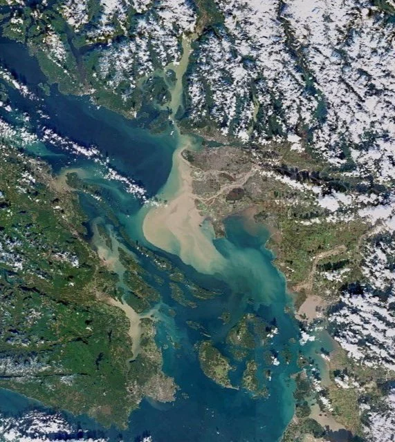 The image above shows the Fraser River outflow during a storm event. The image on the right shows the Fraser River outflow during a regular season. Have a look at False Creek! It is possible to identify that the fresh water from the Fraser River is only entering during extreme weather events.