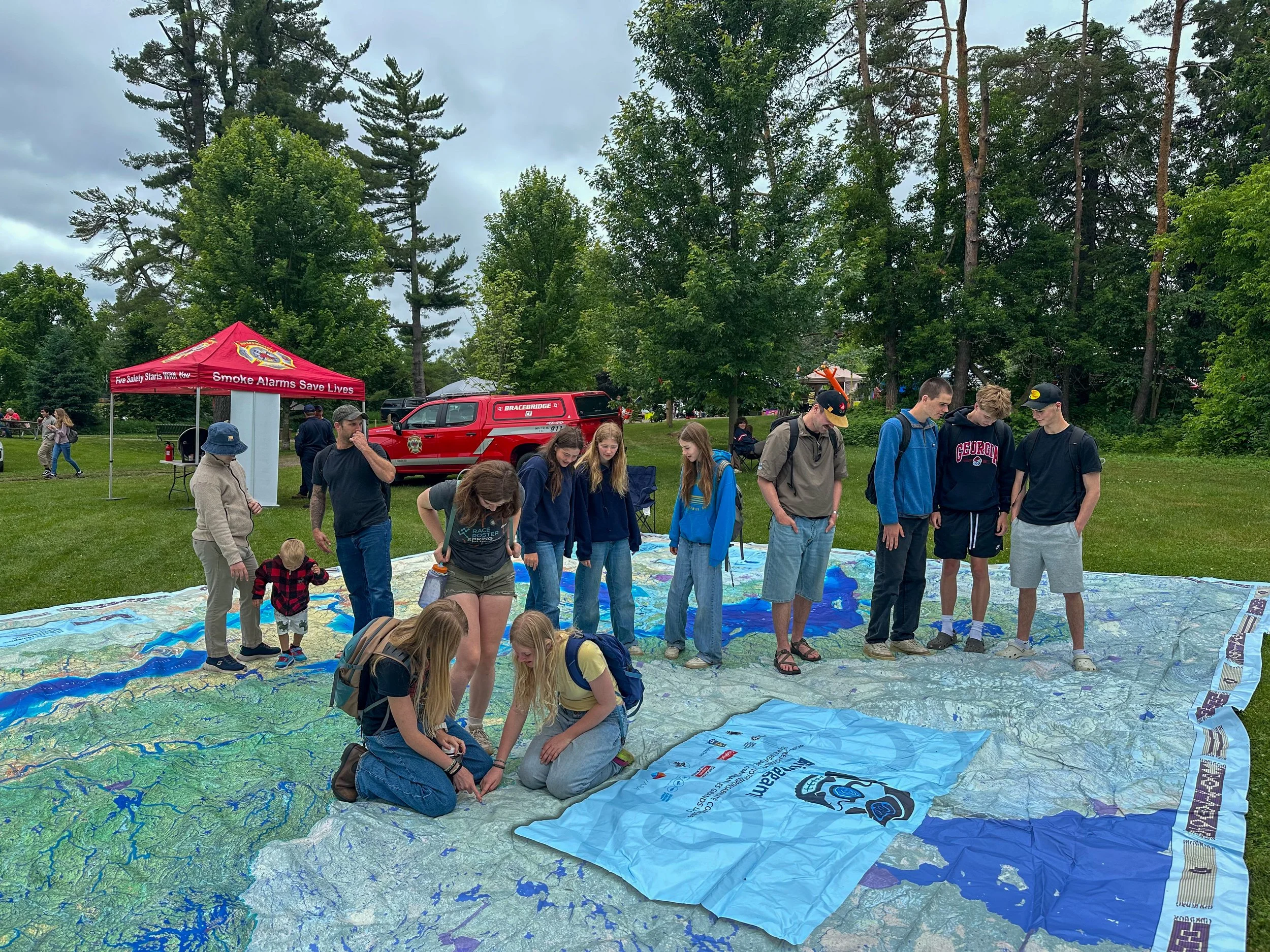 People exploring the Biinaagami map at the Muskoka Through Our Eyes pow wow in Bracebridge, ON, 2025. Photo courtesy of Kai Abreu — Biinaagami.