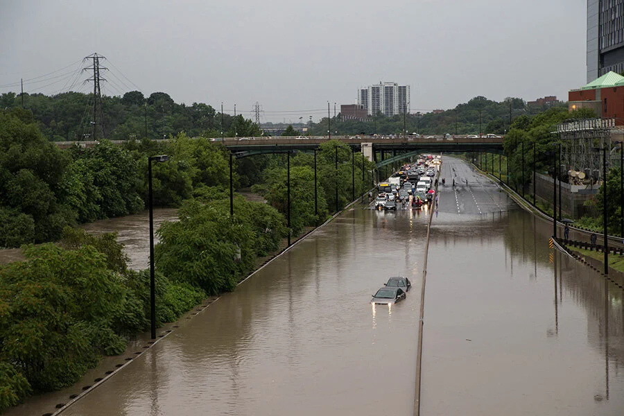 A scene from 2013's Toronto flood: an overwhelmed Don River merging with the DVP as traffic is at a standstill.