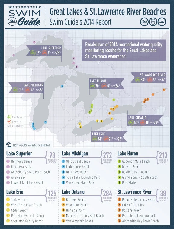 Swim Guide has over 1000 beaches in the Great Lakes Basin. This neat infographic summarizes our Swim Guide’s 2014 Beach Report on the Great Lakes and St. Lawrence River watershed.