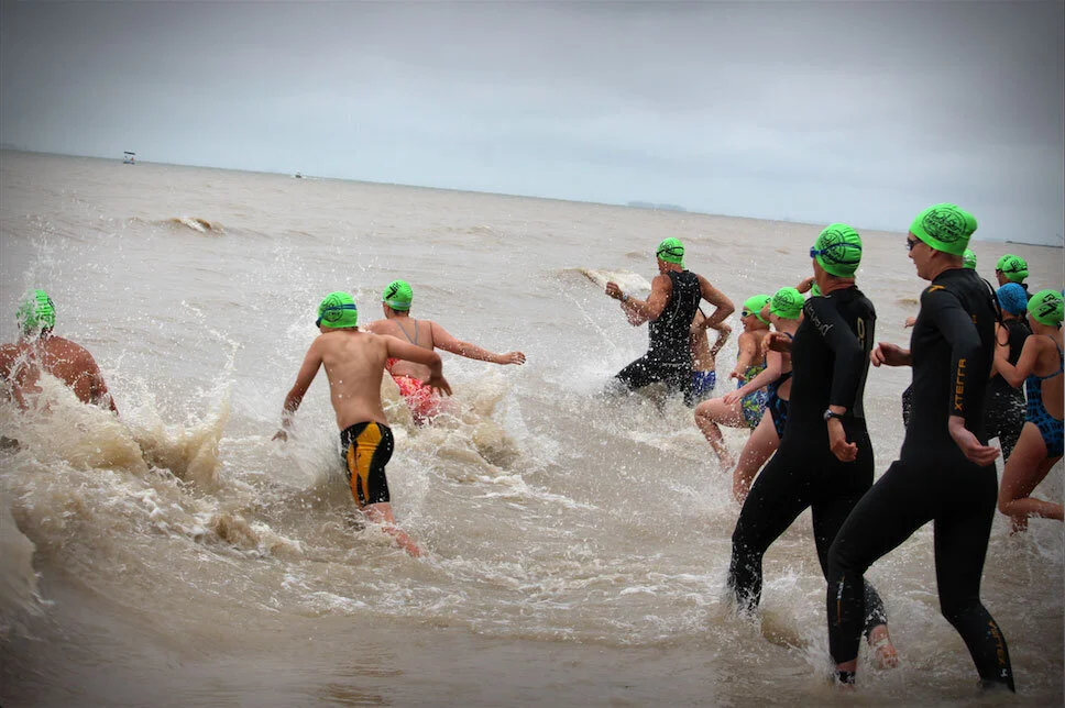 Swimmers bounding into Lake Erie's chilly waters for the North Shore Challenge. (Photo via Lake Ontario Waterkeeper)