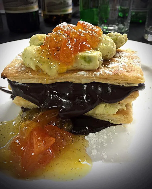 We don’t want to spoil the surprise, so we are showing you the dessert you won’t be eating on April 23: Orange-Kumquat Marmalade Millefeuille with Dark Chocolate Ganache and Pistachio Mousse.