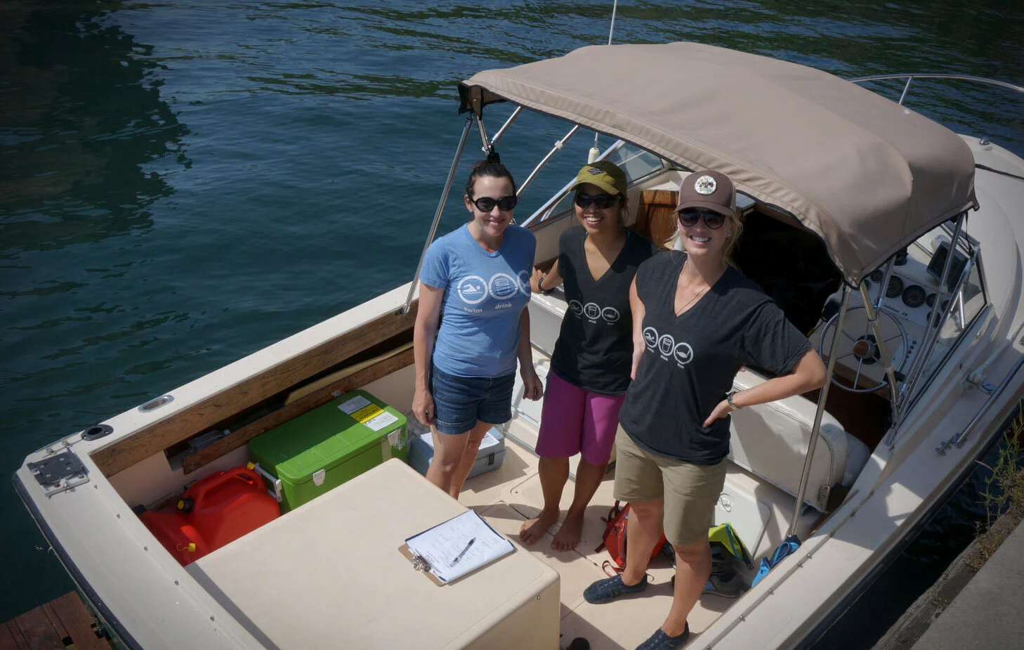 Waterkeeper's team wearing their Swim Drink Fish circles with pride while collecting water samples from Toronto's harbour this past summer. (Photo by Li Black)