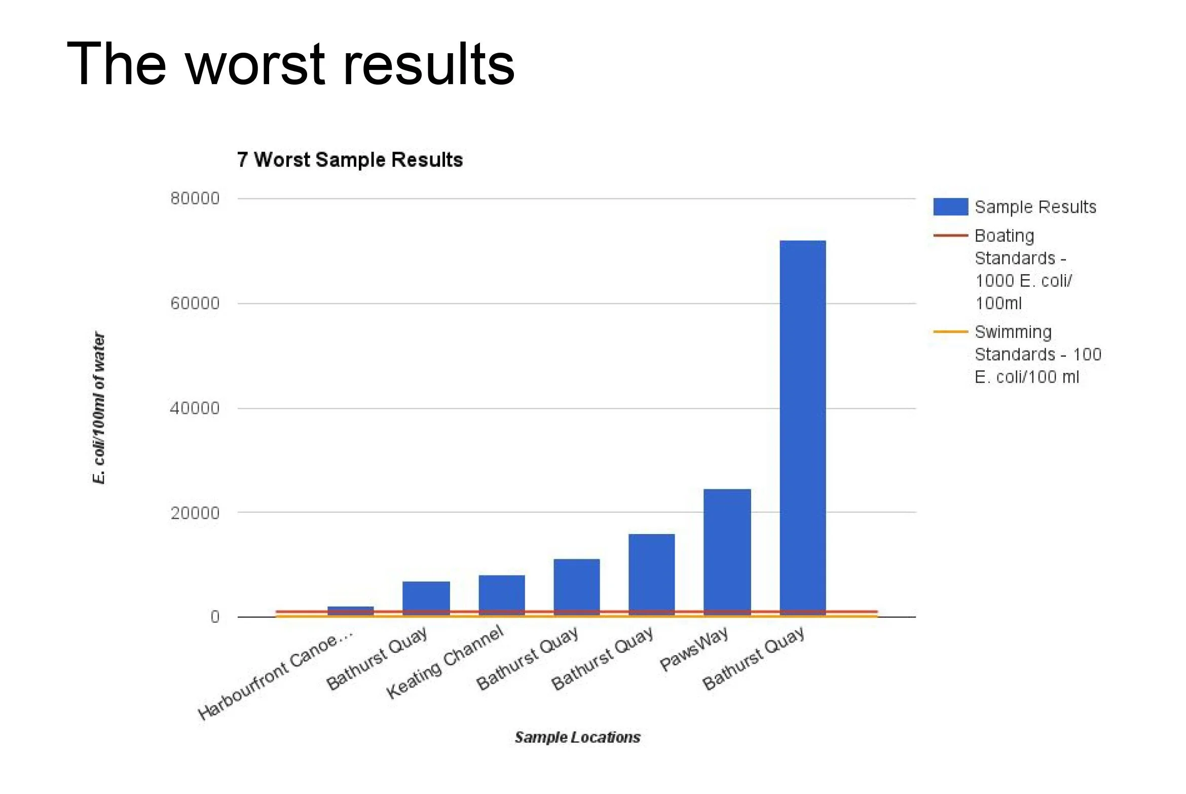 Lab results from sampling water from Toronto's harbour shows worst results were consistently found in the Bathurst Quay.