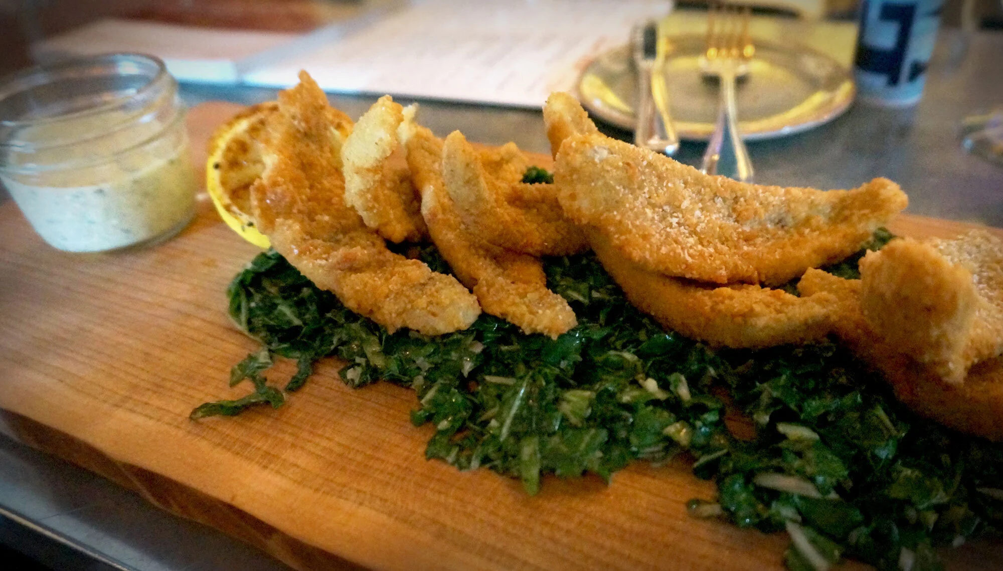 Appetizer: Northern Ontario Style Fish-Fry consisting of fried yellow perch, pickled ramp, & "Mike's atomic relish" tartar sauce, Swiss chard slaw, house-made malt vinegar.