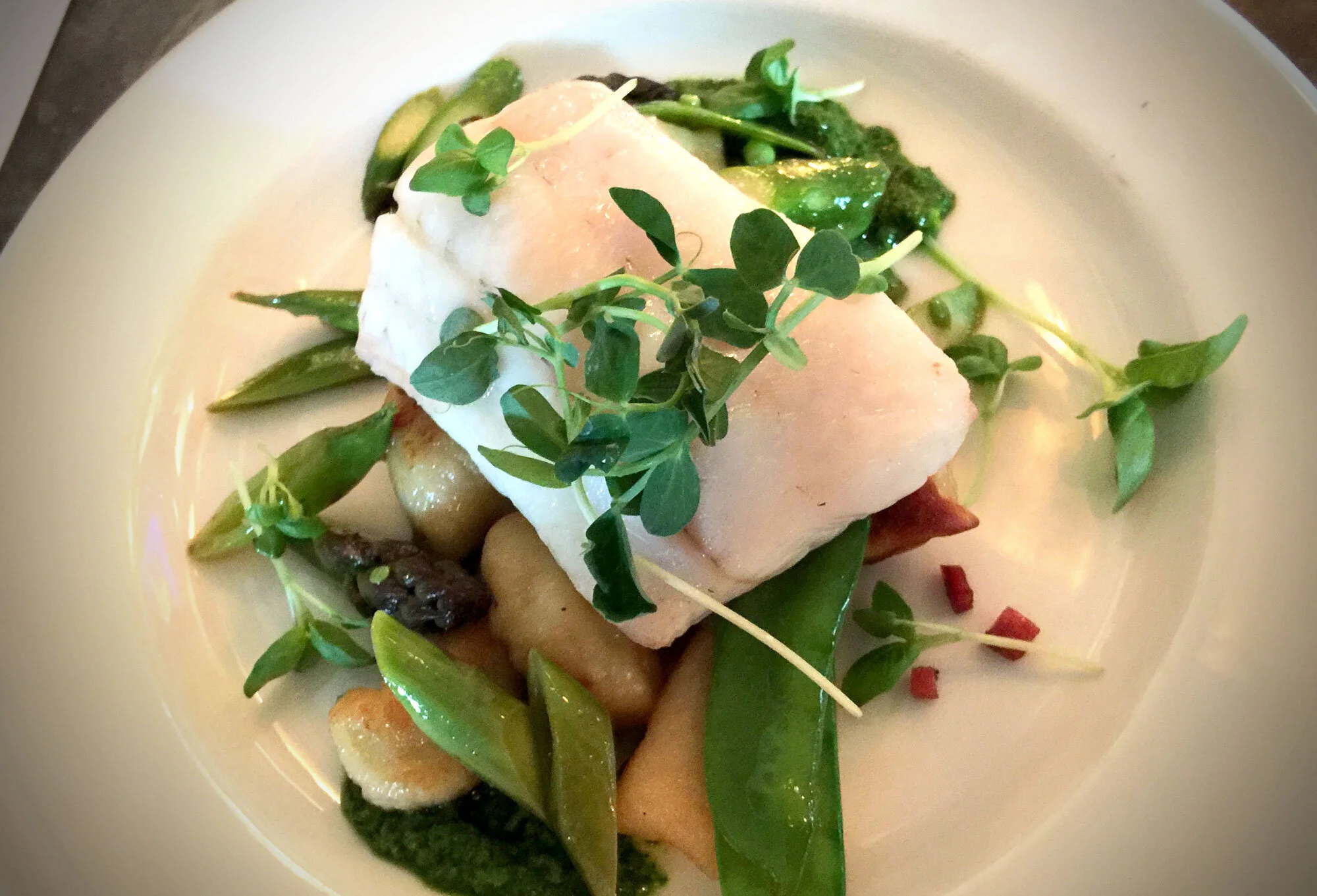 The main course: Baked walleye on lomo-fried potato dumpling, sugar snap peas, roasted asparagus, and preserved lemon-ramp pesto. (Photo by Ruby Pajares)