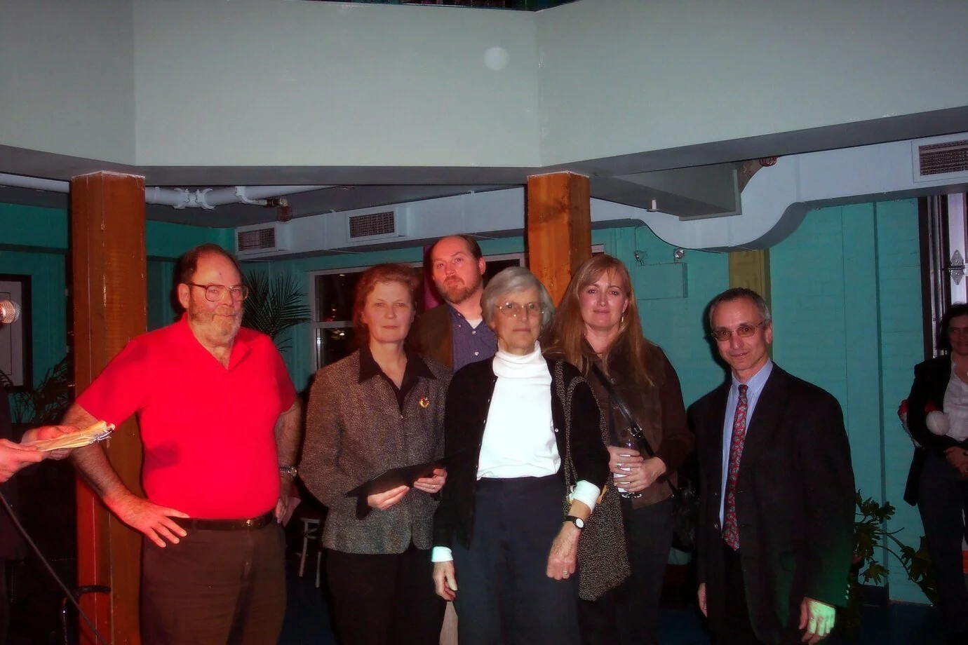 Pat Lawson (centre) being inducted into the Lake Ontario Hall of Fame with Port Hope residents at Waterkeeper's first office in Bambu by the Lake, 2003.