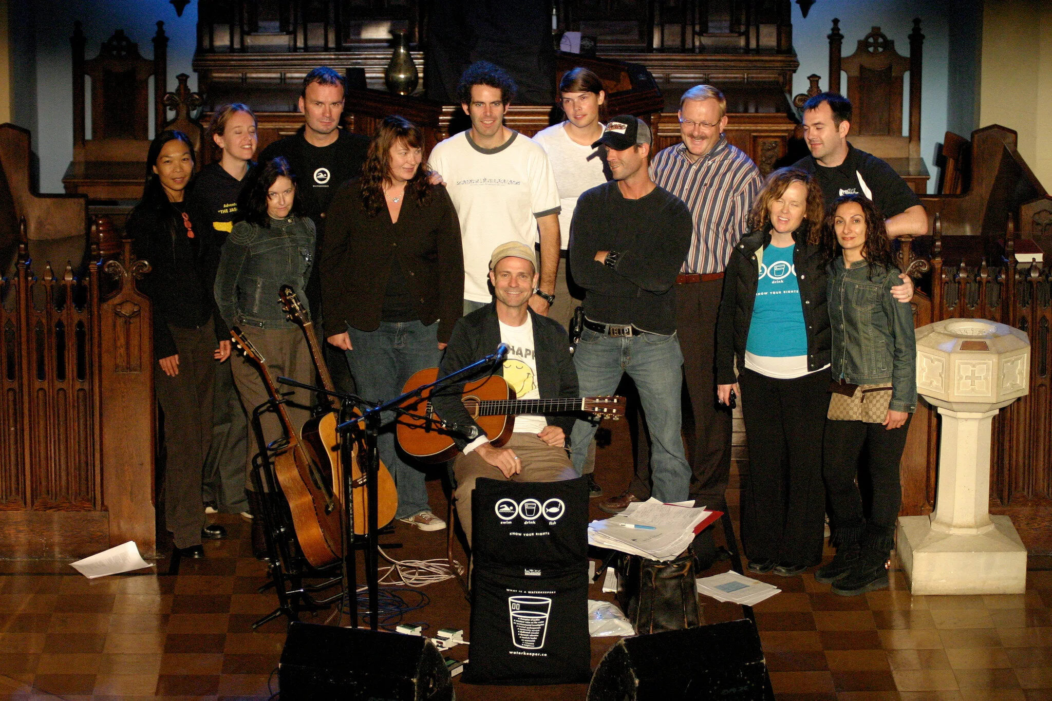 Gord Downie (centre) and Mark Mattson (third from the left, back row) with the Heart of a Lake crew after the final show of Waterkeeper's tour in 2006. Photo by Dylan Neild.