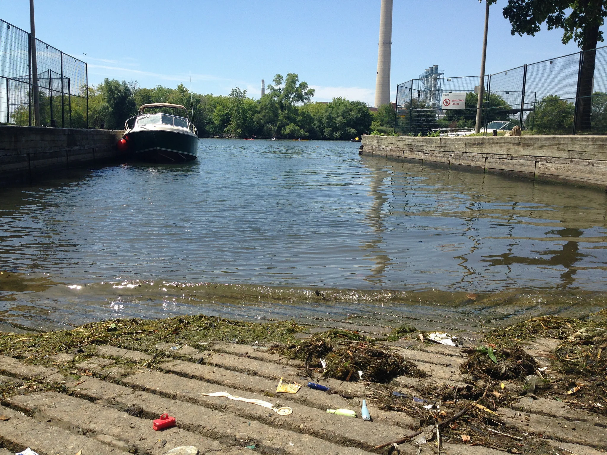 Sewage debris (such as condoms and tampon applicators) found at a boat launch. The smokestack from Ashbridges Wastewater Treatment Facility can be seen in the background. (Photo by Claire Lawson)