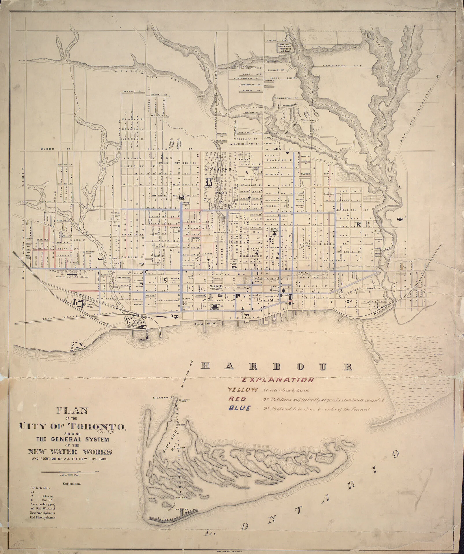 The pipe network in Toronto's inner harbour back in 1876. Existing pipes are in blue and proposed pipes are in red. (Image via Toronto Public Library)