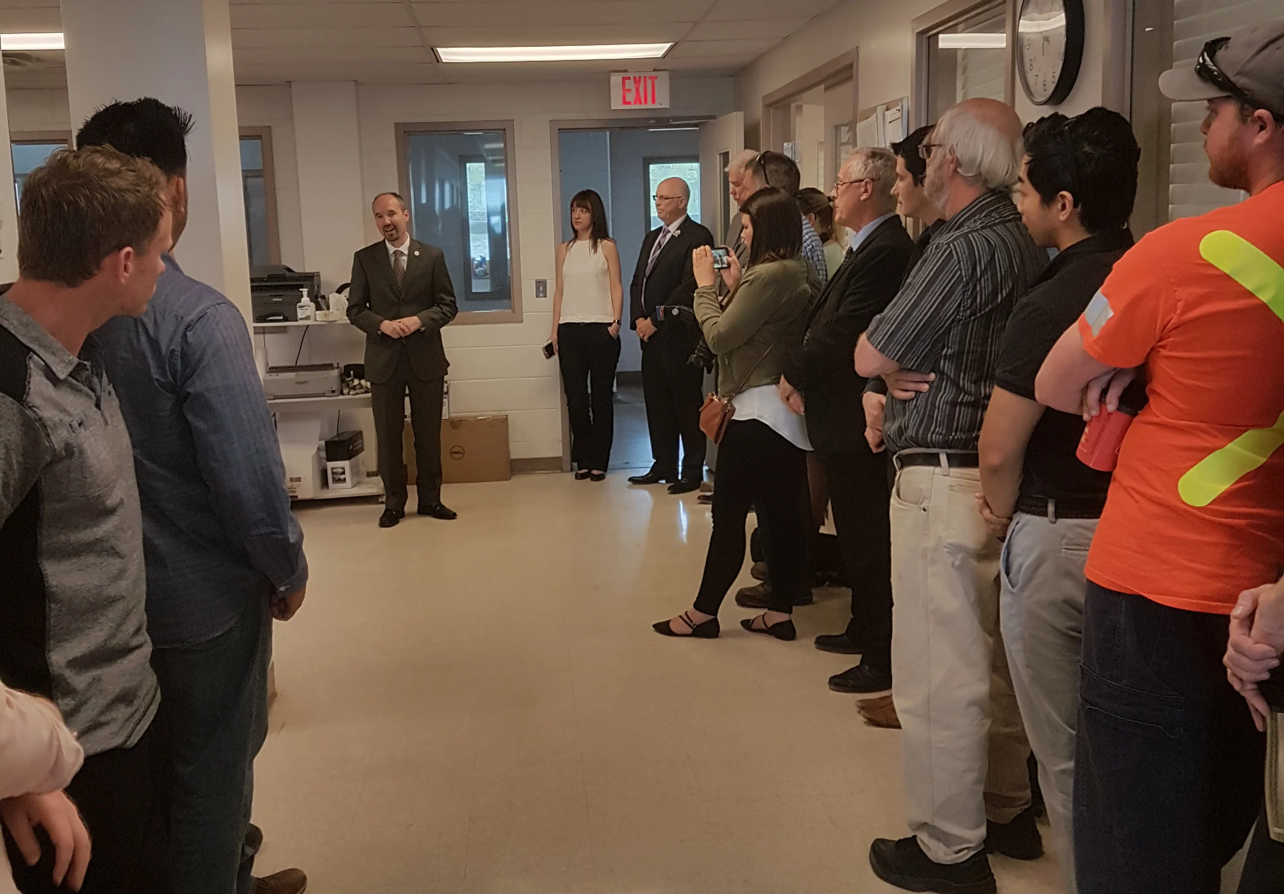 Kingston mayor Bryan Paterson speaking at the King Street Water Treatment Plant about the launch of the overflow notifications.