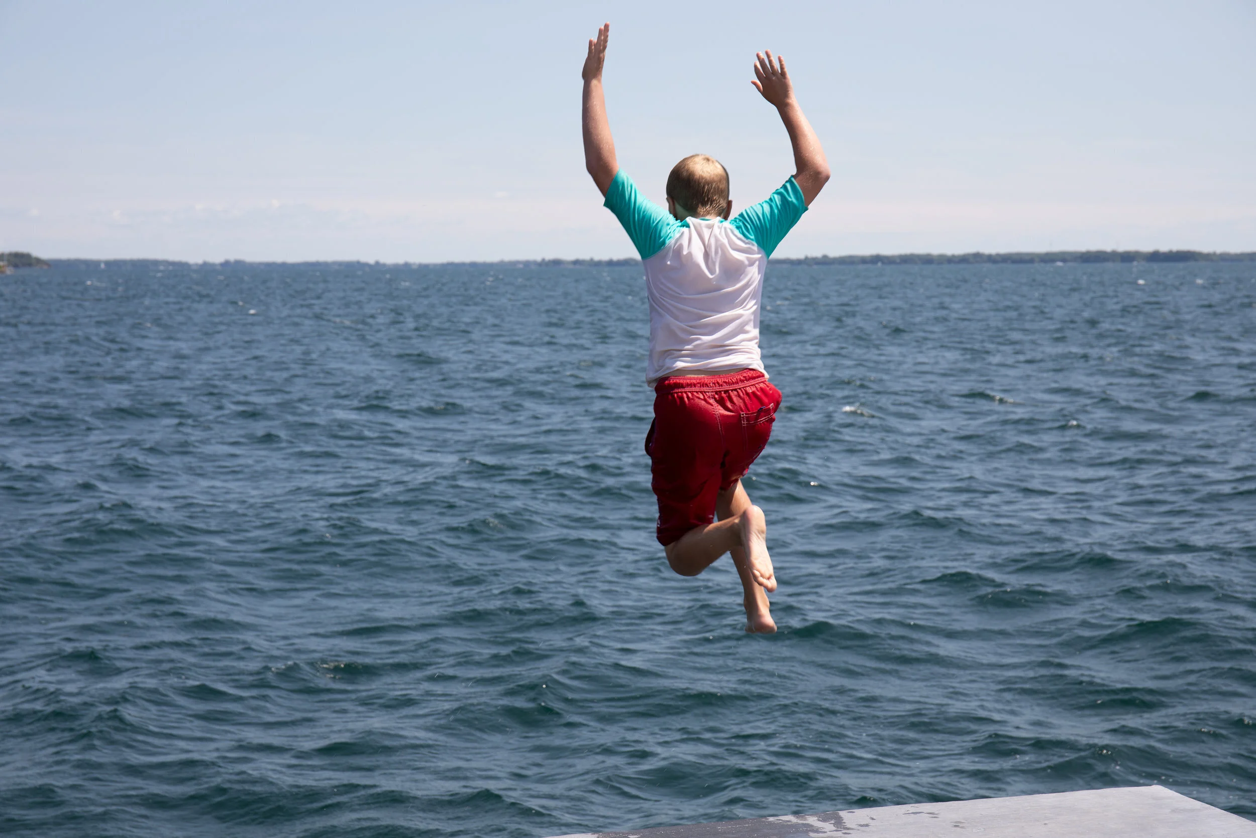 Leaping from the Gord Edgar Downie Pier into Lake Ontario. Photo by Swim Drink Fish.