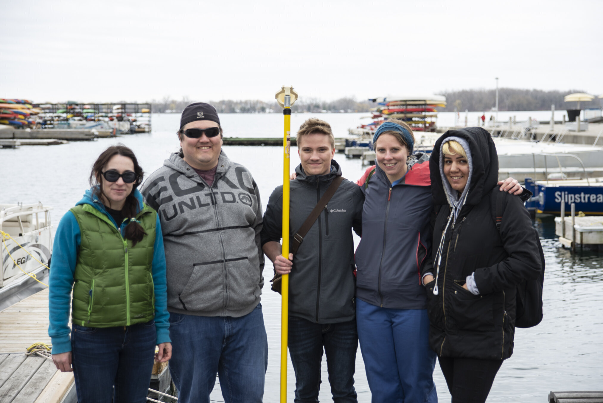 Water sampling training for hub coordinators in Toronto, spring 2019. Left to right: Gabrielle Parent-Doliner, Swim Guide Program Manager, Jonathan Riberdy (Zhiibaahaasing First Nation hub), Gregary Ford (Lake Erie-Niagara hub), Elise Mackie (Toronto hub) and Chelsea Antoine (Zhiibaahaasing First Nation hub) (Photo credit: Swim Drink Fish)